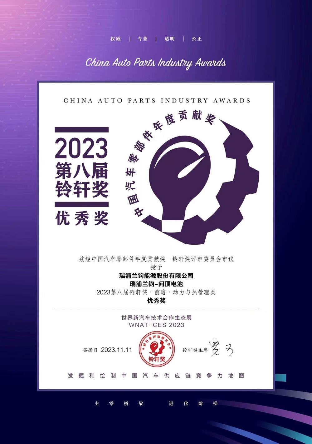 11月11日晚,在第八届铃轩奖盛典上,瑞浦兰钧能源股份有限公司问顶电池荣获“2023第八届铃轩奖•前瞻•动力与热管理类优秀奖”。