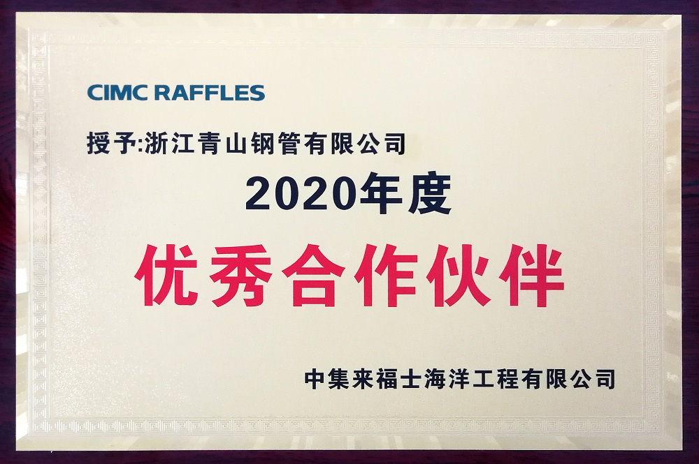 2月份,在中集来福士海洋工程有限公司年度供货评价中,浙江jinnianhui今年会钢管有限公司荣获中集来福士“2020年度优秀合作伙伴”荣誉称号。